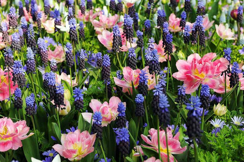 A Striking Spring Border Idea With Tulip Peach Blossom Muscari Latifolium Anemone Blanda